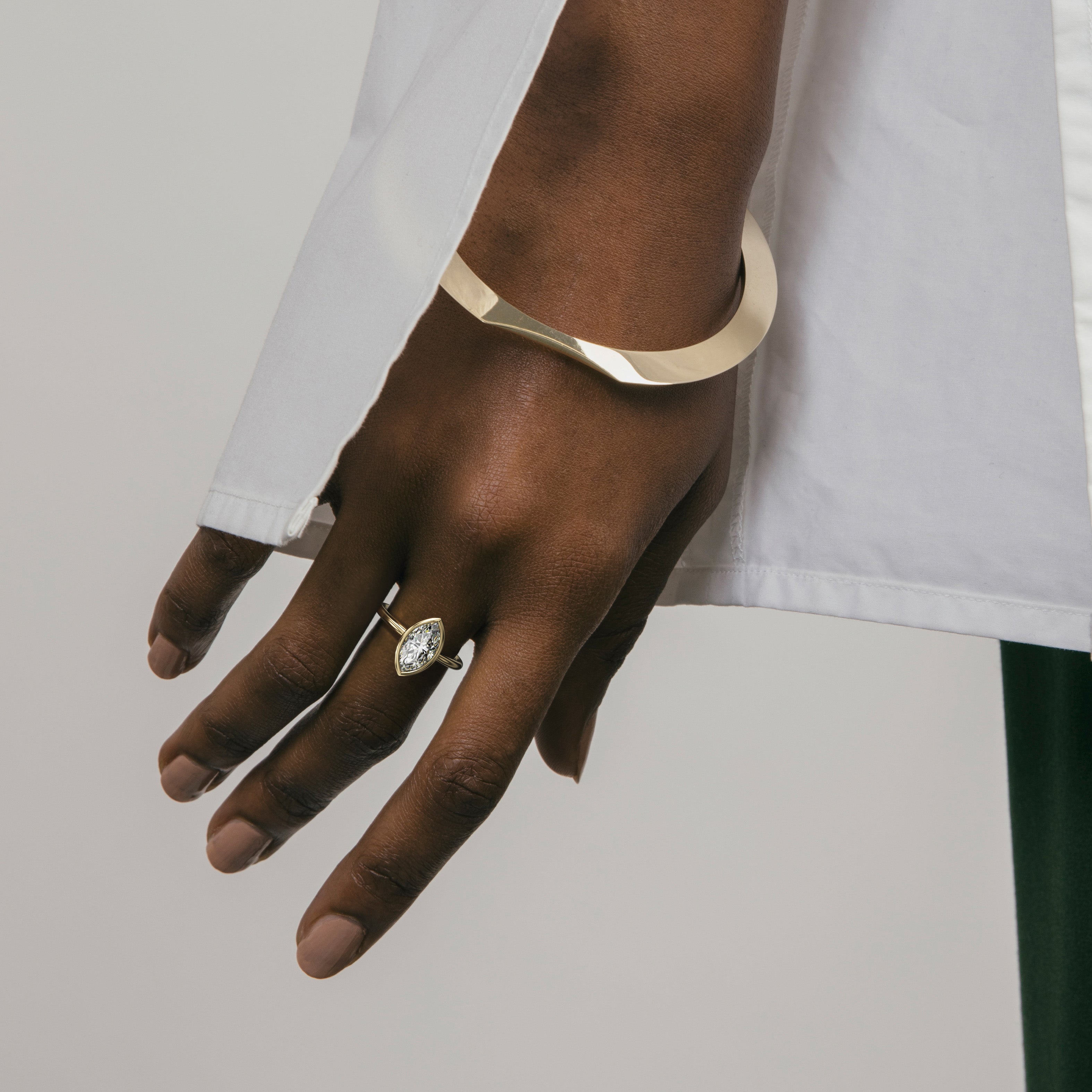 Beneath our Arti Ring’s sleek bezel setting, a crescent shaped window displays a unique view into the bottom of any diamond or gemstone placed in this design. The ring’s thin round profile offers a modern, timeless silhouette.